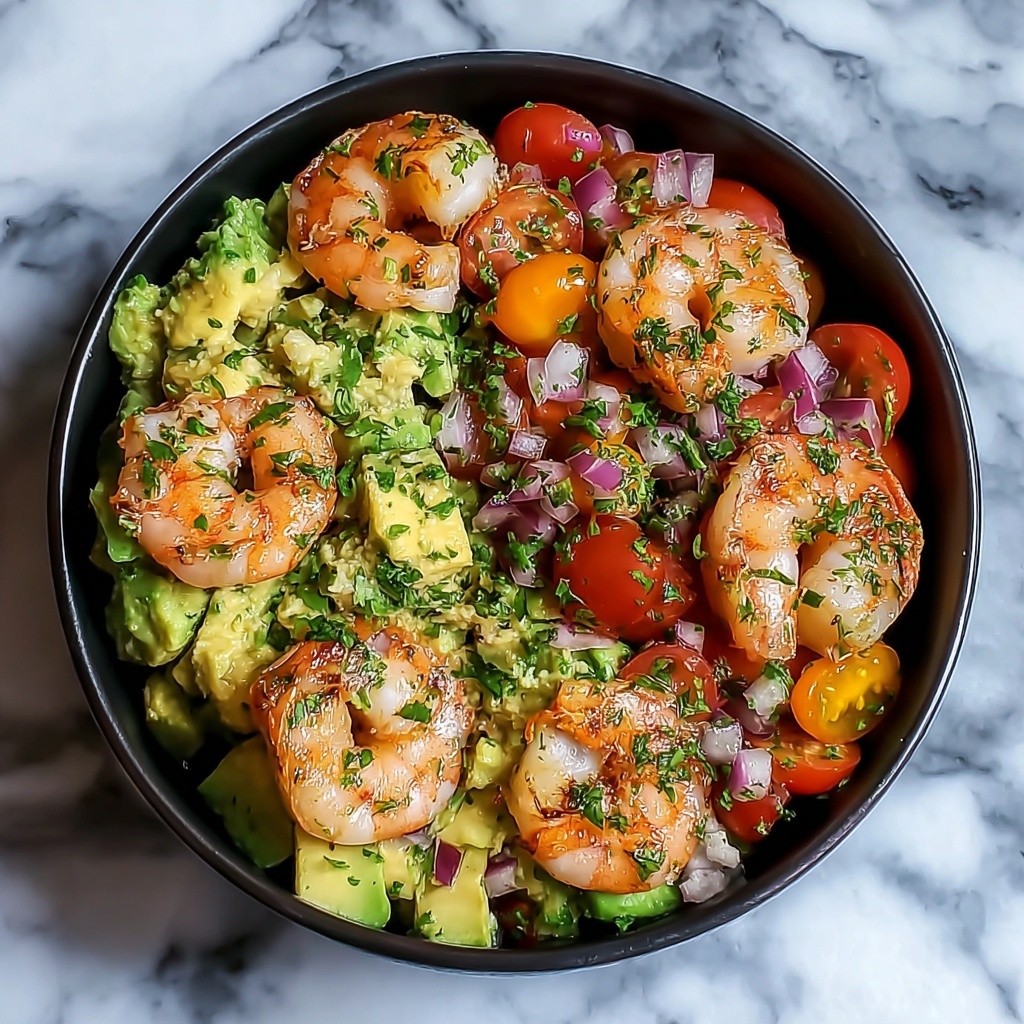 While the shrimp cool slightly, grab a large bowl and combine the diced avocado, finely chopped red onion, fresh cilantro, and halved cherry tomatoes. These ingredients bring freshness, color, and a wonderful texture contrast that is pure harmony.