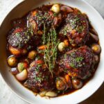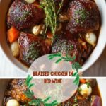 This classic Braised Chicken in Red Wine recipe features tender chicken thighs slowly cooked in a rich and savory red wine sauce with aromatic vegetables and herbs. The dish combines deep flavors from the wine, tomato paste, and fresh thyme, complemented by mushrooms and carrots, making it a comforting and elegant meal perfect for dinner.