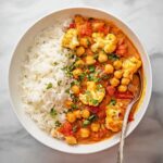 A flavorful and hearty Cauliflower Chickpea Curry featuring roasted cauliflower and a fragrant, spiced coconut tomato sauce. This vegetarian dish is perfect for a cozy meal, combining the crispiness of oven-roasted cauliflower with the creamy richness of chickpeas simmered in curry spices and coconut milk.