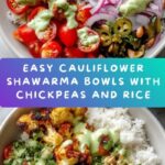 This vibrant Cauliflower Shawarma Bowl features spiced roasted cauliflower and chickpeas served over fluffy basmati rice, topped with a fresh and creamy green tahini sauce, and garnished with crisp cucumbers and juicy cherry tomatoes. Perfect for a flavorful, wholesome plant-based meal that’s easy to prepare and packed with Middle Eastern-inspired spices.