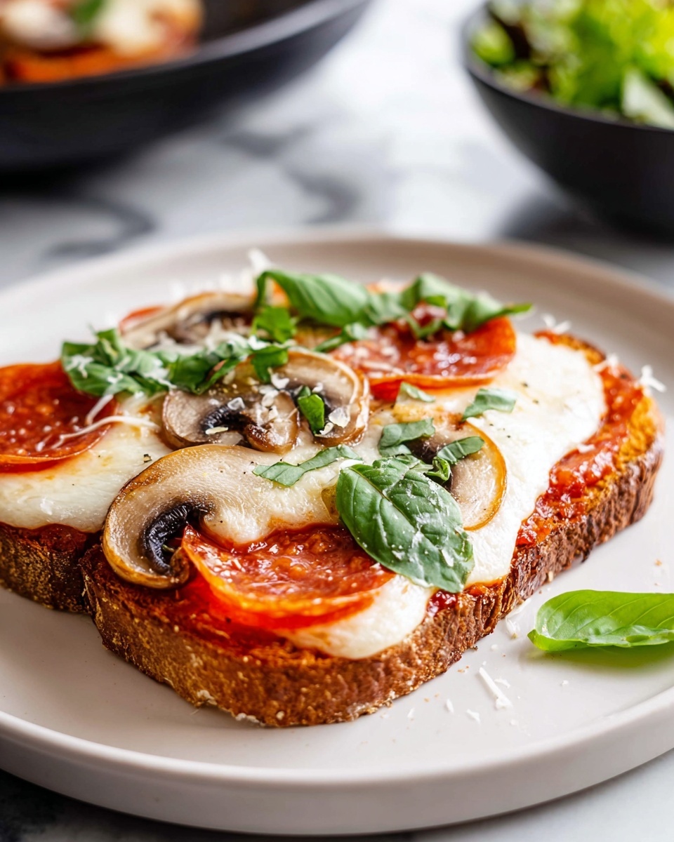 A quick and delicious Pizza Toast recipe featuring toasted Texas bread topped with flavorful pizza sauce, gooey mozzarella cheese, pepperoni, mushrooms, bell peppers, and red onions, all baked to perfection and garnished with fresh basil.