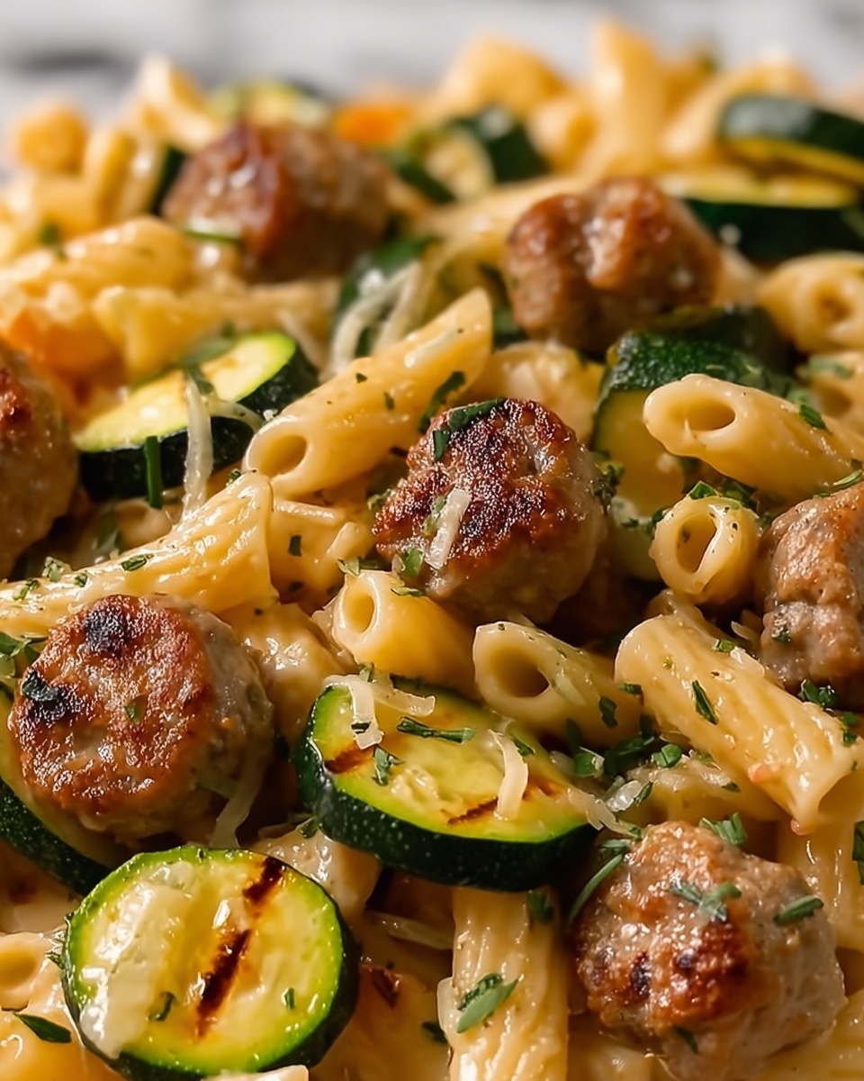 A flavorful and hearty one-pan meal featuring Italian-style chicken sausages, tender zucchini, juicy grape tomatoes, and perfectly cooked Radiatore pasta, all simmered together in a savory chicken broth and finished with fresh basil and Parmesan cheese.