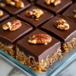 - Prepare the Baking Dish: Line an 8×8-inch square pan with parchment paper, making sure to leave some overhang for easy removal later. Spread the pecan and caramel mixture evenly on the bottom of the pan.