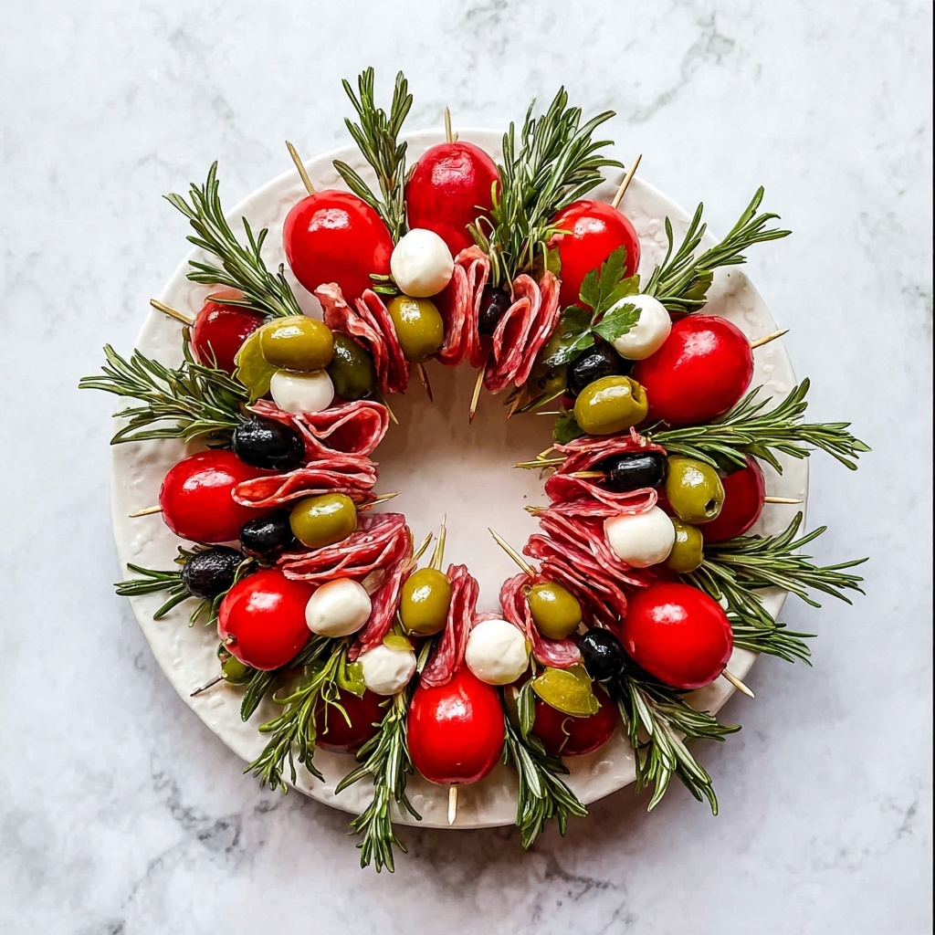 Weave sprigs of fresh rosemary throughout the skewers. This final touch elevates the dish with its festive aroma and jewel-like green contrast, bringing the whole Christmas Antipasto Wreath Recipe together in style. Your guests will love both the look and the fresh herbal scent.