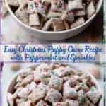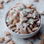 This festive Christmas Puppy Chow recipe combines crispy rice Chex cereal with a deliciously smooth chocolate, peanut butter, and butter coating flavored with vanilla and peppermint extracts. Topped with colorful Christmas sprinkles and dusted with powdered sugar, this sweet treat is perfect for holiday parties or gifting.