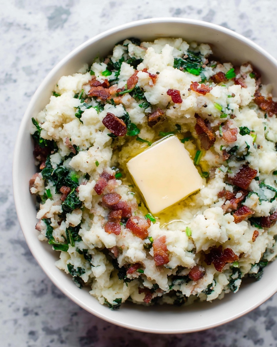 Time to bring everything together! Mash your cooked potatoes with butter and heavy cream until luxuriously smooth. Then fold in the bacon and greens mixture, stirring everything until it’s fully incorporated. Taste and season with salt and pepper as needed—this is where the flavors truly marry into something magical.