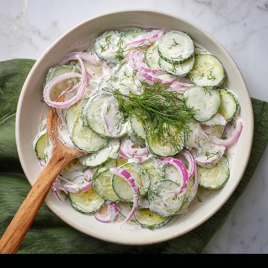 This Creamy Cucumber Salad is a refreshing and tangy side dish featuring thinly sliced English cucumbers and red onions tossed in a smooth sour cream and dill dressing. The cucumbers are lightly salted and rested to retain a crisp texture, making this salad perfect for warm weather meals or as a cool accompaniment to grilled foods.