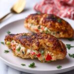 This Fajita Stuffed Chicken recipe features juicy boneless chicken breasts stuffed with a flavorful sautéed mixture of bell peppers, onions, and melted Monterey Jack cheese. Searing the chicken on the stove creates a golden crust before finishing in the oven to juicy perfection. Served with fresh lime wedges and your favorite Mexican-inspired toppings, this dish offers a delicious and colorful meal perfect for a weeknight dinner.