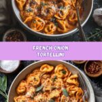 This French Onion Tortellini recipe combines the rich, caramelized flavors of classic French onion soup with tender cheese tortellini. The dish features slowly caramelized onions and a savory broth sauce, topped with melted Gruyère and Parmesan cheeses, making it a comforting and elegant meal perfect for any occasion.