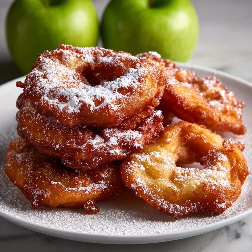 Crispy, golden fried apple rings coated in a spiced batter and dusted with powdered sugar. These delightful apple treats are perfect as a warm dessert or snack, optionally served with caramel sauce or honey for added sweetness.