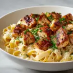 This Garlic Butter Chicken Bites with Creamy Parmesan Pasta is a comforting and flavorful one-pan dish featuring tender, seasoned chicken pieces sautéed to golden perfection and tossed with fettuccine in a rich, creamy Parmesan sauce. Perfect for a quick yet indulgent weeknight dinner, it combines simple ingredients with classic Italian seasoning to deliver a delicious meal that’s both satisfying and easy to prepare.