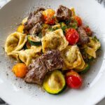 Continue cooking the remaining steak and vegetables until the steak reaches your preferred level of doneness and the veggies develop a nice char without losing their crispness. Then, pile them on top of the tortellini, creating an irresistible medley of textures and flavors.