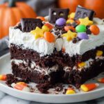 This Halloween Graveyard Poke Cake is a spooky and delicious dessert featuring moist chocolate cake soaked in sweetened condensed milk, topped with creamy whipped topping and crushed chocolate cookies to resemble dirt. Decorated with gummy worms, candy pumpkins, and tombstone-shaped cookies, this fun and festive cake is perfect for Halloween parties or any celebration needing a creepy-cute treat.