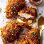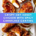 This Hot Honey Crunch Chicken recipe features tender, crispy chicken tenderloins coated in a spicy, crunchy cornflake and parmesan crust. Baked to golden perfection and drizzled with a warm, flavorful hot honey sauce infused with smoky chipotle, cayenne, and aromatic spices, it’s a perfect balance of heat and sweetness. Garnished with fresh herbs, this dish is simple to prepare and sure to be a crowd-pleaser for any meal.