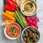 Leftover components of the Hummus Board with Fresh Vegetables, Grape Leaves, and Crispy Snacks Recipe keep really well when stored separately in airtight containers. The hummus stays fresh in the fridge for up to a week, while the grape leaves also last several days. Store veggies uncut in the fridge to maintain their crunch.