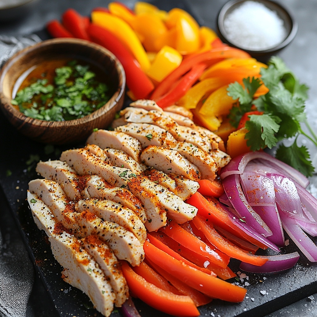 2. Prepare Ingredients. Slice the chicken breasts into thin strips. Cut the bell peppers and onion into similarly sized strips for even cooking.