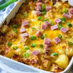 In a separate bowl, mix together the shredded cheddar cheese, diced ham, and sliced green onions. Distribute this cheesy, savory topping evenly over the chicken and potatoes. This step promises a melty, flavorful crown that brings the dish together brilliantly.