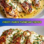 Transfer the seared chicken to a baking dish and spread a thin layer of ranch dressing over each breast. Then, combine Parmesan, provolone, cheddar cheese, and crushed crackers in a bowl. Press this cheesy mixture firmly onto the chicken breasts, forming a thick, crispy crust that will bake to bubbly perfection.