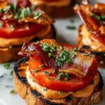 Arrange your Mini Tomato Sandwiches with Bacon Mayonnaise Recipe on a tiered tray for a charming tea-party vibe, or line them up neatly on a rustic wooden board with edible flowers for color contrast. These ideas turn your snack into an eye-catching centerpiece that guests won’t be able to resist.