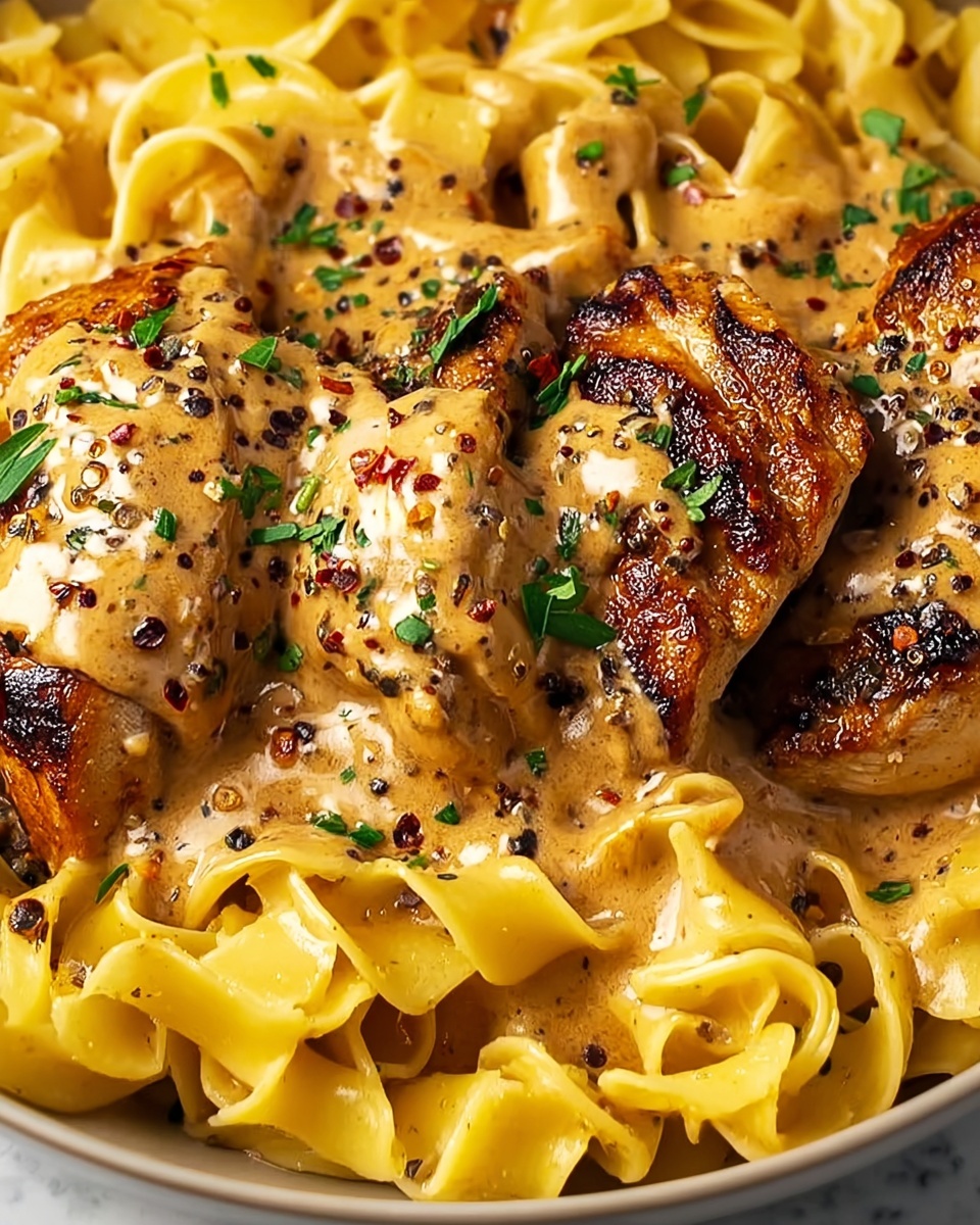 For a memorable dinner, serve the chicken sliced atop a bed of the creamy egg noodles on large, rustic plates. Drizzle any extra sauce over the top and scatter fresh parsley or even some chili flakes for a little heat. Using a warm cast-iron skillet right at the table also amps up the cozy vibes and keeps the meal piping hot.