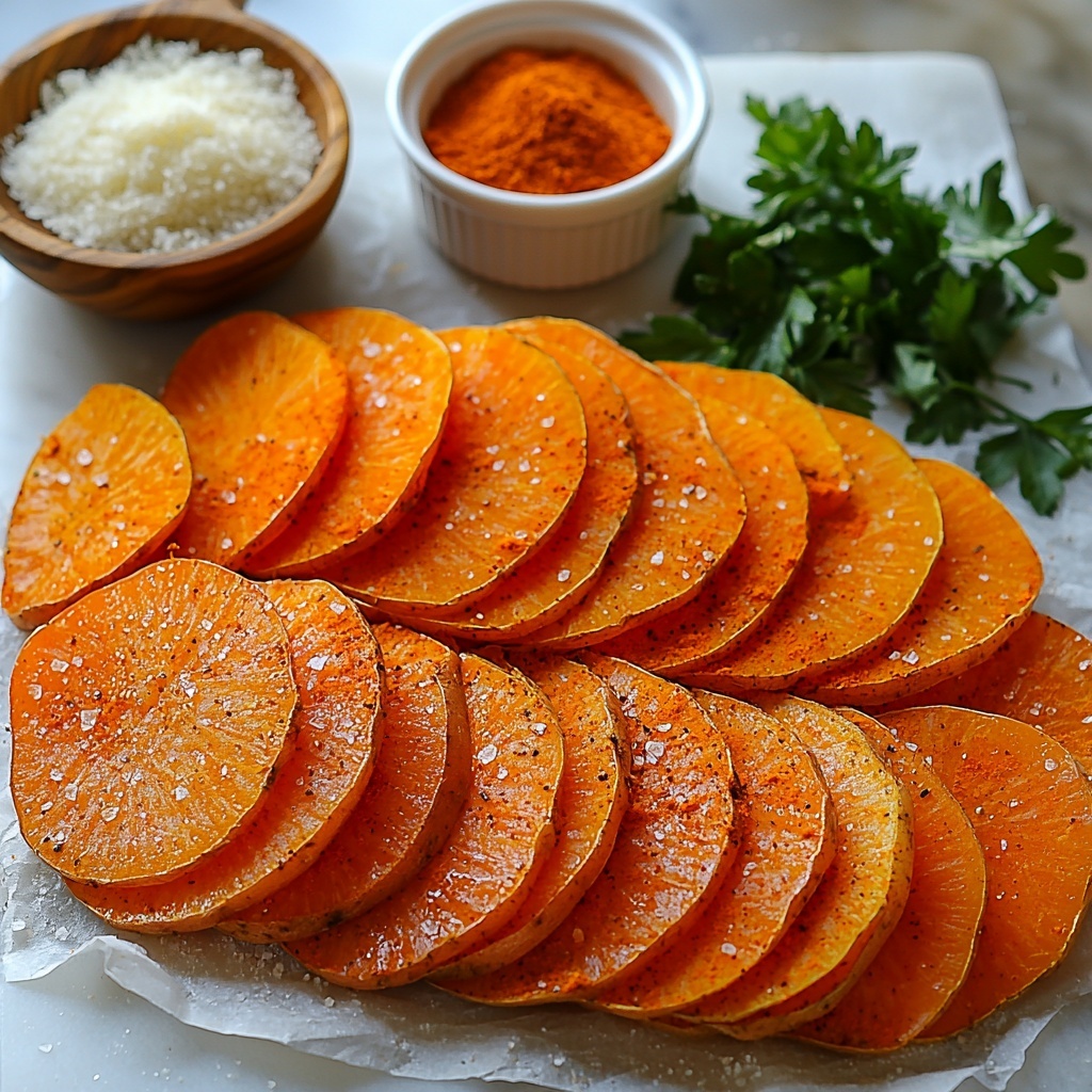 Start by preheating your oven to 400°F (200°C). Line a baking sheet with parchment paper to prevent sticking and make cleanup a breeze. While the oven heats up, peel your sweet potatoes and slice them into quarter-inch thick rounds. This thickness is ideal for balancing tenderness with that coveted crispy exterior.