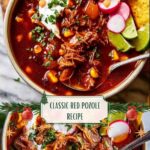 The magic of Pozole Rojo (Red Posole) Recipe is in how you top it. Fresh, crisp shredded cabbage, thinly sliced radishes, diced onions, chopped cilantro, juicy lime wedges, creamy avocado slices, and a dollop of Mexican crema or sour cream make each spoonful pop. These garnishes add bright, crunchy textures and layers of fresh flavor that cut through the rich stew.