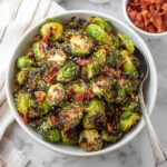 Once roasted, transfer the Brussels sprouts to a serving bowl and sprinkle generously with freshly grated Parmesan cheese and cooked bacon crumbles. Finish with a beautiful drizzle of balsamic glaze for that perfect sweet and tangy contrast. The result? A dish that’s vibrant in color and bursting with contrasting textures and flavors.