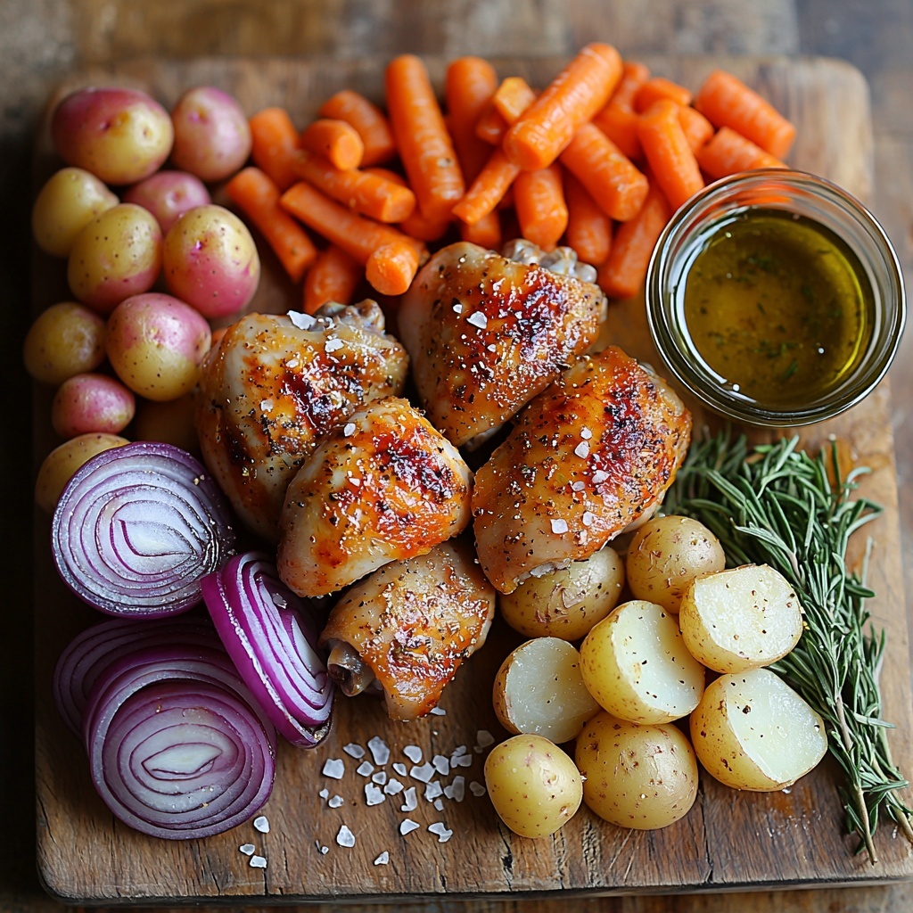 This Roasted Garlic Chicken and Vegetables recipe features tender bone-in, skin-on chicken thighs or drumsticks roasted to golden perfection alongside a medley of baby potatoes, carrots, and red onions. Infused with a fragrant marinade of olive oil, garlic, fresh herbs, and spices, this one-pan meal is hearty, flavorful, and simple to prepare, perfect for a comforting family dinner.
