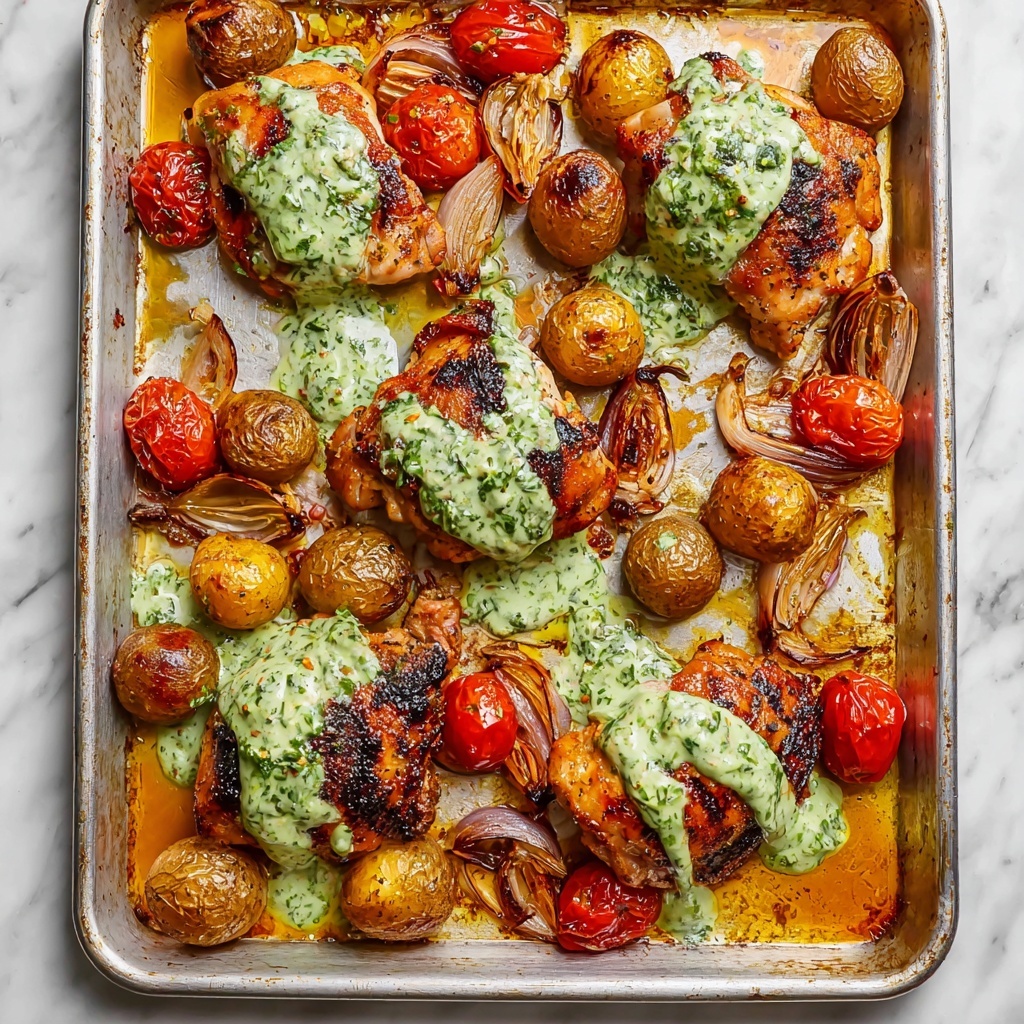 Once roasted, drizzle the fragrant herb yogurt sauce generously across the chicken, potatoes, and tomatoes. Serve directly from the sheet pan for a rustic feel or transfer to a serving bowl for a more polished presentation. This final touch brings together every savory, spicy, and creamy element in perfect harmony.