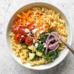 To take this Roasted Veggie Pasta with Feta Recipe over the top, sprinkle some freshly chopped basil or parsley right before serving. A few cracked red pepper flakes add a wonderful gentle heat for those who like a bit of spice. A drizzle of extra virgin olive oil or a squeeze more lemon juice can brighten it up even further.