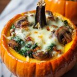 This delightful recipe features mini pumpkins stuffed with a savory mixture of sausage, rice, cranberries, and pecans, roasted to tender perfection. It combines hearty ground pork sausage with earthy mushrooms, fresh kale, and a hint of apple cider sweetness, all topped with Parmigiano-Reggiano cheese for a rich, comforting meal perfect for fall or holiday gatherings.