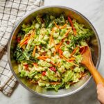Start by gently tossing the thinly sliced Savoy cabbage, crisp diced English cucumber, sweet grated carrots, red bell pepper, and fresh green onions together in a large bowl. This mix forms the fresh, crunchy canvas for the rest of the flavors to layer on.