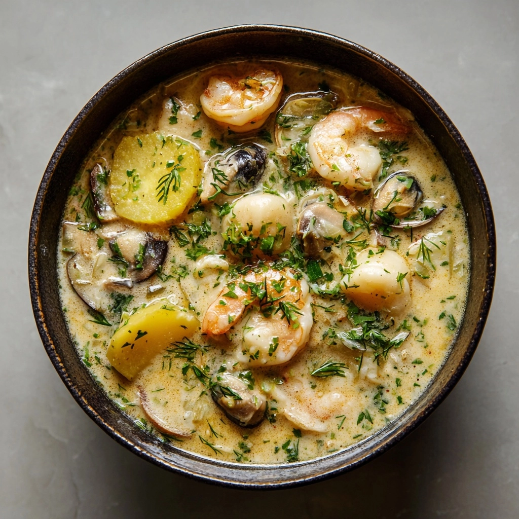 A rich and creamy New England-style seafood chowder featuring shrimp, scallops, cod, and optional clams, simmered with aromatic vegetables and seasoned with Old Bay and thyme. This comforting soup is perfect for a hearty meal and served best with oyster crackers or crusty bread.