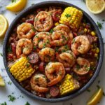A flavorful and hearty Shrimp Boil featuring succulent large shrimp, tender baby potatoes, sweet corn, and smoky sausage, all cooked together in a seasoned broth and served with a fragrant parsley butter sauce and fresh lemon wedges.