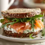 A delicious and elegant smoked salmon sandwich featuring creamy dill cream cheese, fresh cucumber, red onion, and peppery arugula on hearty multigrain or rye bread. Perfect for a quick, no-cook lunch or light meal with a European-inspired flair.