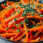 - Add Garnish: Just before serving, sprinkle the toasted sesame seeds over the marinated carrots and optionally garnish with finely chopped green onions for added freshness and texture.