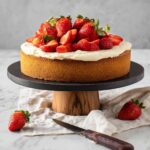 Spread the whipped mascarpone cream evenly over the cooled cake surface. Then, generously top with fresh, sliced strawberries for that burst of vibrant color and juicy sweetness. Serve right away to enjoy the full freshness and texture contrast.