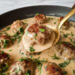Return the browned meatballs to the pan with the sauce. Let them cook together gently for another 5 minutes so the meatballs absorb the sauce’s depth of flavor, and the sauce thickens around them in all their creamy glory. This final simmer is where the magic happens, making the dish irresistibly comforting and richly satisfying.