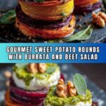 - Assemble the Sweet Potato Rounds: Once the sweet potato rounds are roasted, transfer them carefully to a serving platter. Top each round with a generous spoonful of burrata cheese, a few pieces of roasted diced beets, and a dollop of the walnut sage pesto.