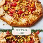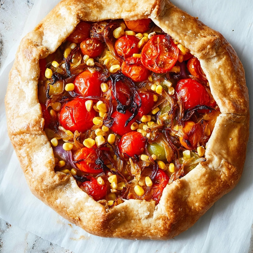This Tomato Galette recipe is a rustic, savory tart featuring a flaky homemade crust filled with a vibrant mixture of sautéed garlic, onions, corn, and juicy cherry tomatoes, topped with creamy buffalo mozzarella. Perfect as a light meal or appetizer, this galette combines fresh summer flavors with an easy-to-make pastry crust baked to golden perfection.