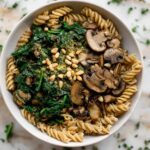 A flavorful and nutritious Vegan Spinach and Mushroom Pasta made with chickpea-based pasta, sautéed mushrooms, fresh spinach, and toasted pine nuts. This quick and easy recipe combines simple ingredients for a satisfying plant-based meal perfect for weeknight dinners.