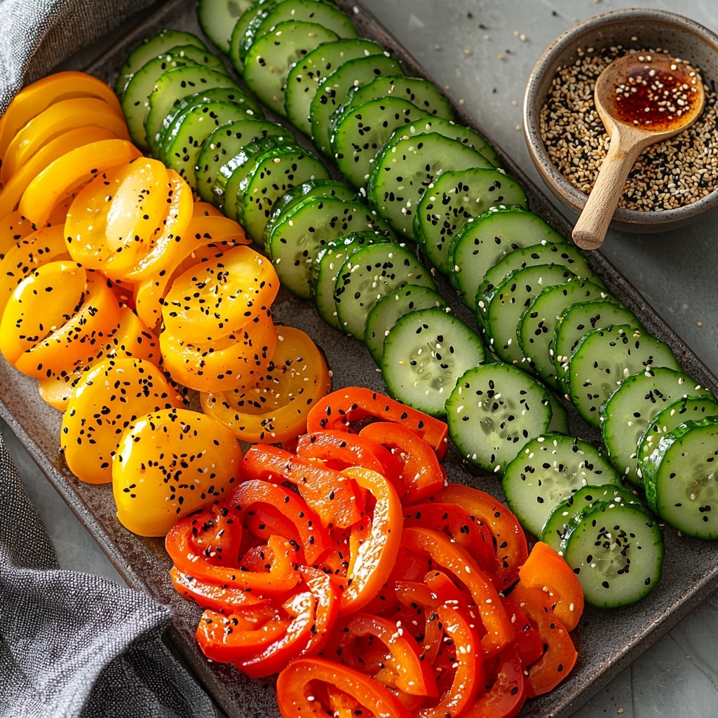 - Slice Vegetables: Thinly slice the mini cucumbers into circles and cut the mini bell peppers into thin slices to ensure even coating and ease of eating.