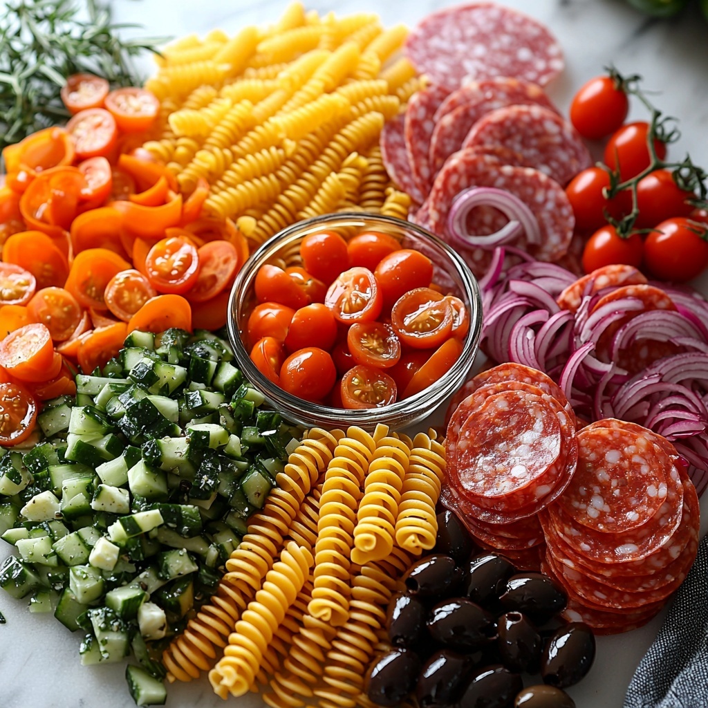 - Add remaining ingredients: Incorporate sliced salami, pepperoni, halved cherry tomatoes, sliced black olives, diced orange and green bell peppers, chopped red onion, chopped pepperoncini, and fresh mozzarella pearls into the pasta. Gently mix until everything is evenly combined.